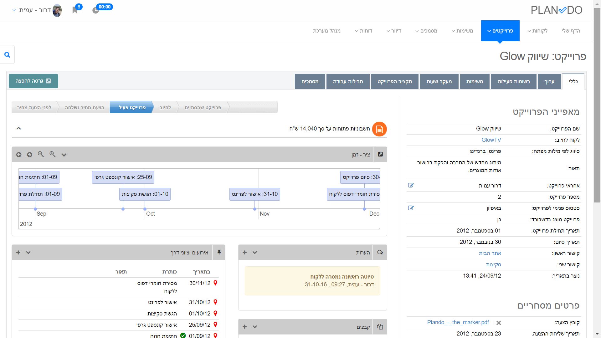 - מאפייני הפרוייקט - פרטים כלליים ורקע, שיוך ללקוח, סטטוס, סיווג וכיוצ"ב.